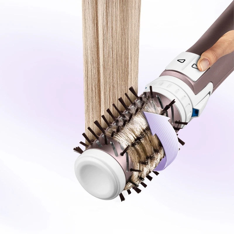 Commencez en utilisant la brosse de plus grand diamètre pour sécher et mettre en forme vos cheveux. Progressez mèche après mèche, des racines jusqu’aux pointes. Pour la touche finale, utilisez la brosse de petit diamètre qui vous permettra d’accentuer le sens des pointes.